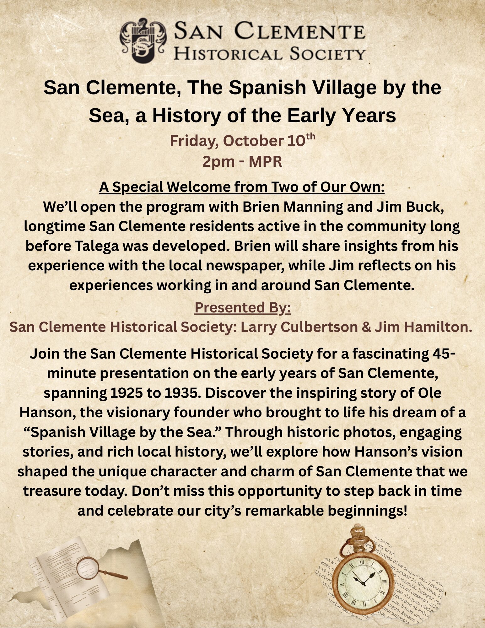 Ended FREE Historical Society Workshop Register Fri, Oct 10, 2025, 2:00 – 3:00 PM PDT Clubhouse, 22 Calle Galeria, San Clemente, CA, USA Map Add to calendar Register Contact us Oscar Hernandez os••••z@sea••••t.com (949) 361-4685 Location Clubhouse, 22 Calle Galeria, San Clemente, CA, USA